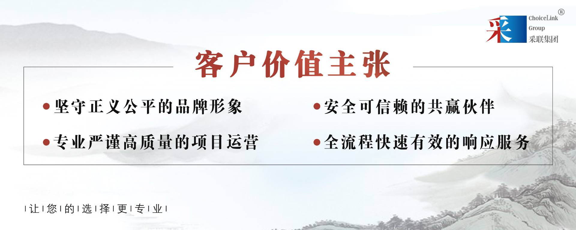 采聯(lián)集團(tuán)致力于為廣大客戶提供采購全流程專業(yè)服務(wù),堅(jiān)守“守正出奇”的核心價(jià)值觀,以公平公正為原則,不斷優(yōu)化服務(wù)、堅(jiān)持創(chuàng)新發(fā)展。依托多元化、專業(yè)化的服務(wù),不斷向“締造最具創(chuàng)新力的采購服務(wù)品牌,構(gòu)筑采購領(lǐng)域最專業(yè)的資源交互平臺(tái)”的遠(yuǎn)大愿景邁進(jìn)。
